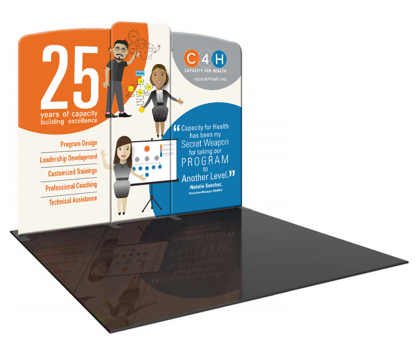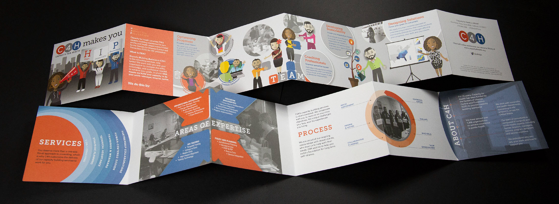 C4H (Capacity for Health) helps organizations reach their potential. They provide them with the resources, training, and knowledge to achieve their goals. For their upcoming conference, they wanted to stand out from their competitors. To set them apart, I used illustrations to depict their services for their brochure and trade show display. Using characters based on actual employees of the company, I was able to make the materials more eye-catching.