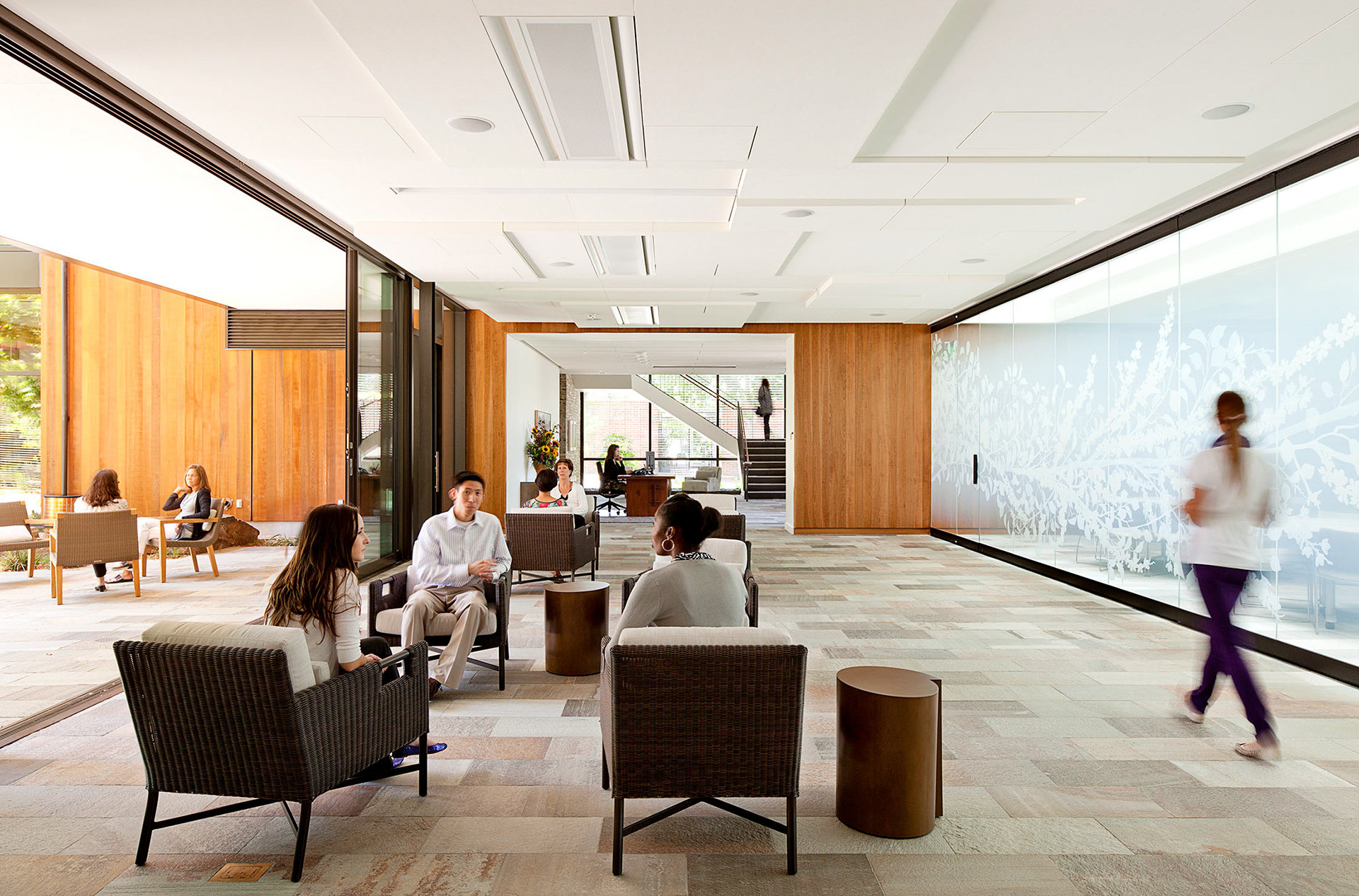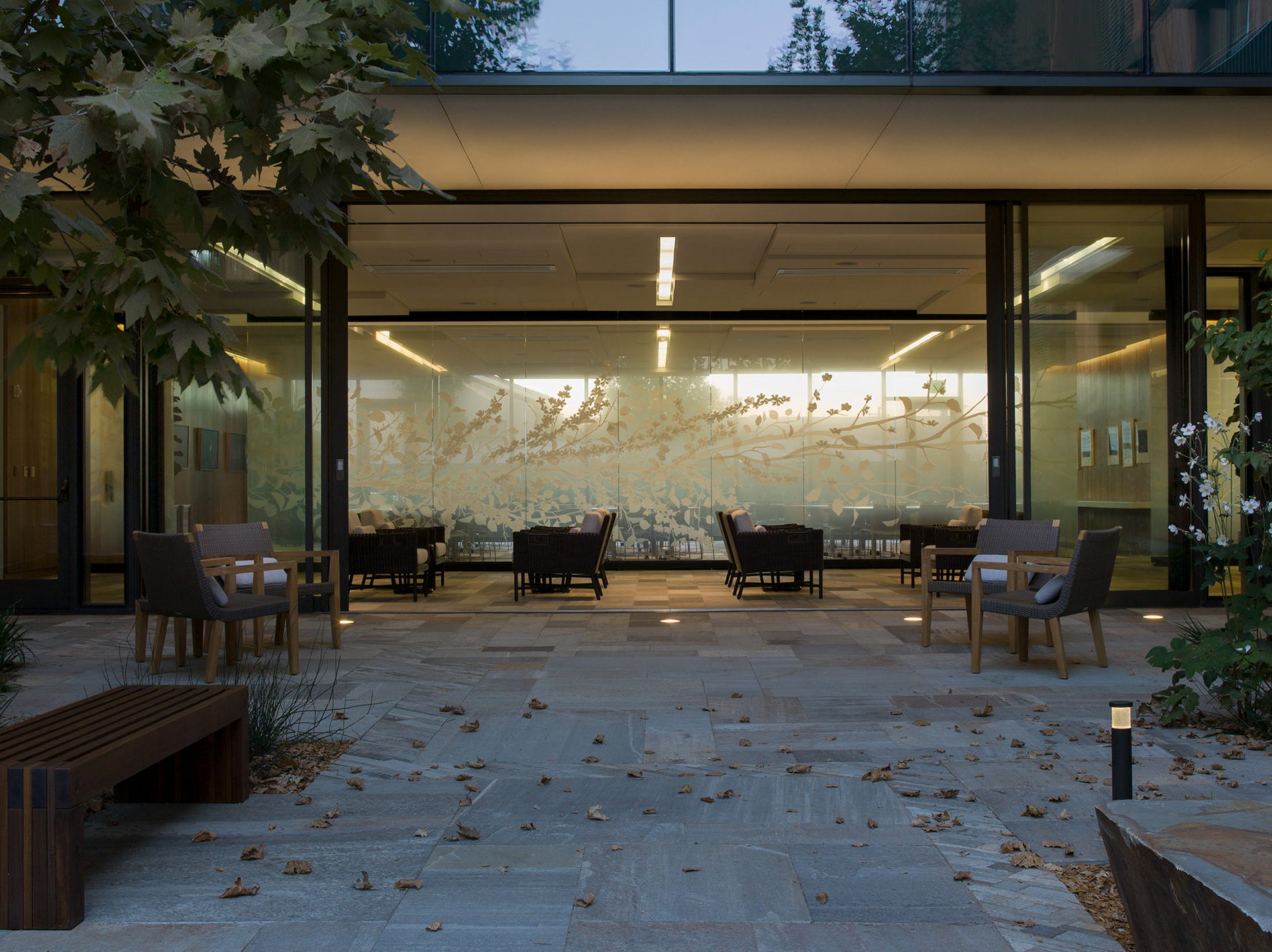 A 50 feet wide removable glass wall that separates the lobby to the multi-purpose room. The Packard Foundation wanted it to be semi-transparent yet still provide privacy.